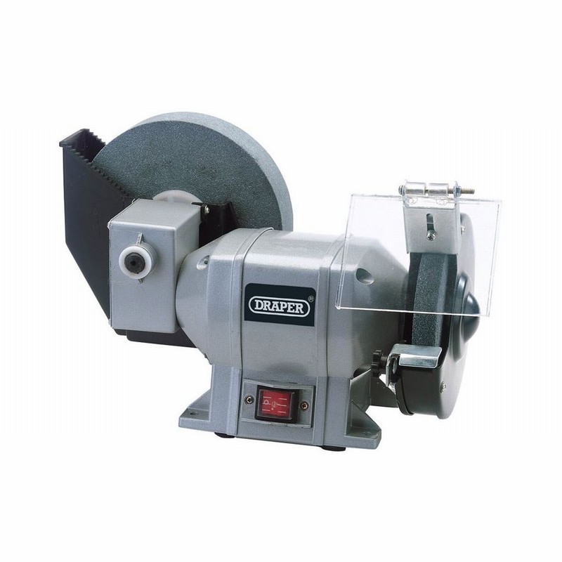 Designed for the workshop to hone and grind hand and garden tools. With a vertical whetstone honing wheel, dry grinding wheel, eye protection shield, spark deflectors, wheel guards and adjustable tool rests. Uses dry grinding wheel especially suitable for high speed steel tooling. Fitted with a cable and approved plug.