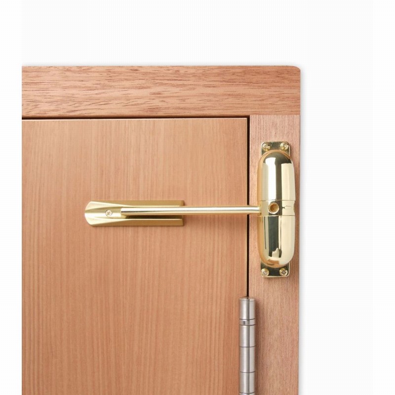 Sterling Surface Mounted Brass Parallel Armed Door Closer – Spring Loaded with adjustable tension which can close a door up to 68kg, helps reduce heat loss and draughts, for indoor use. 1/2 hour fire door tested to BS EN 1634-1