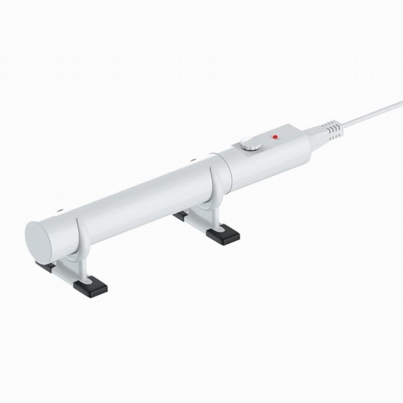 A compact slimline eco-heater designed to provide gentle background heat in small indoor spaces, helping to prevent damp, mould and condensation. The 28-watt unit features a low-profile white steel housing, automatic safety shutoff and an IP44 rating for reliable use in moisture-prone areas.