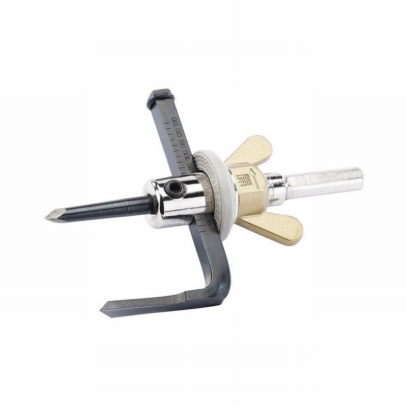 Combination shank for hand brace or power drill. Speed range 200 rpm when cutting holes above 90mm diameter increasing to 800rpm for 40mm diameter holes. The cutter has an easy to use adjustment nut, graduated beam and hardened pilot point. For wood and plastics, maximum cutting depth 30mm.