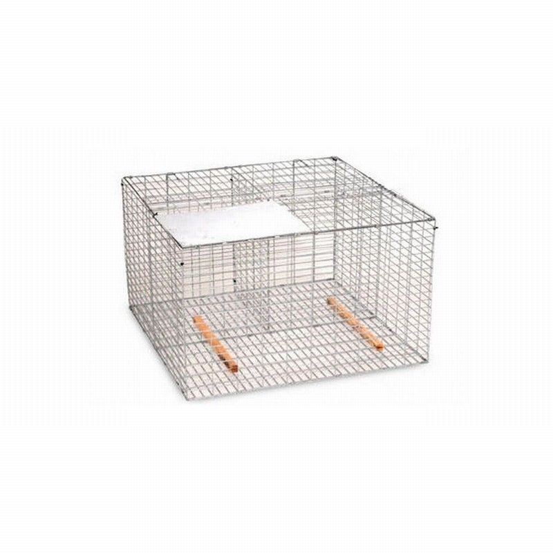 This is a traditional device for the humane trapping of magpies or other types of crow. To attract magpies, a call-bird (or decoy) is placed inside the cage’s largest compartment to act as a lure, and when the intruder enters the door on the top of the cage and lands on the perch below, it triggers the trap, safely catching it.