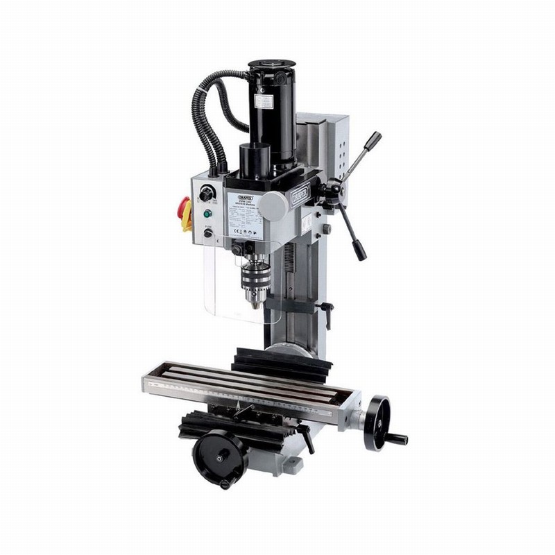 Draper 350w Variable Speed Milling and Drilling Machine – Precision metal working lathe, incorporated with a powerful 350W motor delivering excellent power output capable of handling most materials. The milling/drilling machine encompasses a working table with T slots, which enables clamping and securement of work. Each milling/drilling machine is fitted with metric graduated compound scales, column tilt feature (0-45°), a front mounted NVR switch and finely tuned 3-plane adjustment table. All these features make for an excellent milling/drilling machine, ideal for small industrial units.
