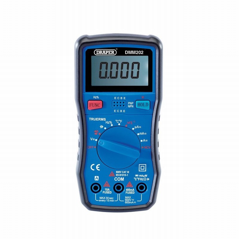 Auto ranging achieving TRMS 5999 counts and voltage, current, hEF, continuity, resistance, temperature, diode and non contact voltage testing. Fitted with a backlit LCD screen, auto power off, continuity buzzer and data hold features. Supplied with test leads, temp probe and 1 x 6F22 9V battery.