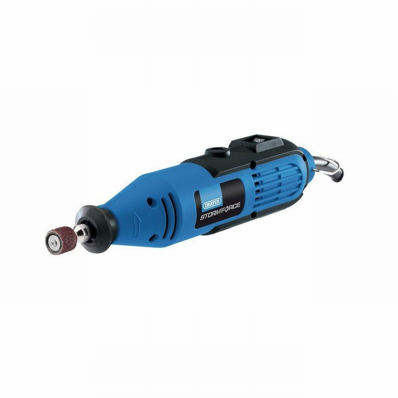 Variable speed, Spindle lock, Supplied with 1.8M cable with BS Plug and 57 accessory pieces (5 collets, wheel holder and 20 wheels, disc holder, 3 x drill bits, 2 x milling points, 10 x grinding points, 2 x brushes, 10 x large sanding drums, and collet spanner)