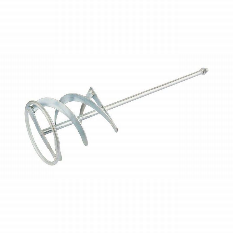 Twin blade paddle mixer, for plaster. Manufactured from steel with a protective zinc coating and attached with a M14 thread. The twin helical ribbon pushes the plaster from the top towards the bottom helping alleviate the spraying of the mixture. Suitable for use with most manufacturers powered mixers.