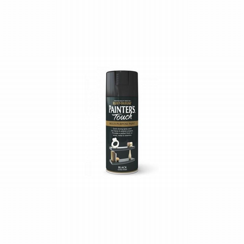 400ml Rustoleum Painters Touch Black Gloss Spray Paint – A multi-purpose decorative and protective aerosol spray paints ideal for everyday projects. Typical applications include painting of furniture, cabinets, doors, frames, vases, baskets, trim and general bric-a-brac. High quality, fast-drying formulation is suitable for indoor and outdoor use, giving a smooth, durable finish.