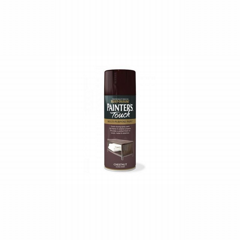 400ml Rustoleum Painters Touch Chestnut Gloss Spray Paint – A multi-purpose decorative and protective aerosol spray paints ideal for everyday projects. Typical applications include painting of furniture, cabinets, doors, frames, vases, baskets, trim and general bric-a-brac. High quality, fast-drying formulation is suitable for indoor and outdoor use, giving a smooth, durable finish.