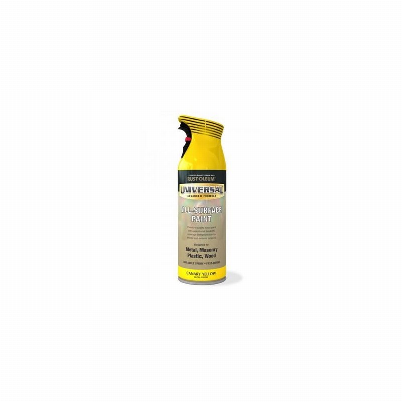 400ml Rustoleum Universal Canary Yellow Gloss All Surface Spray Paint – The world’s first all-surface spray paint. Its ergonomic comfort grip houses a unique trigger mechanism which delivers an advanced spray system that can dispense paint at any angle – even upside down!