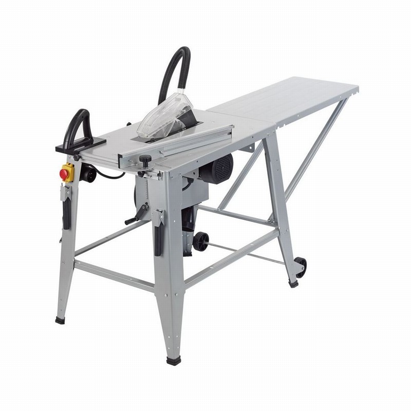 Ideal for workshop use, with the added benefit off being fitted with large rear wheels, perfect for transporting to and from different work sites. The large extension table can be fitted to the side or the rear of the saw for added flexibility. Supplied with: 40T TCT blade, mitre guide, dust extraction hose. push stick and moulded cable and approved plug.