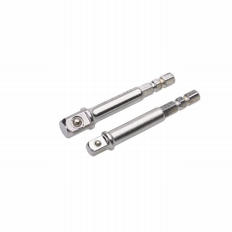 Designed for use in conjunction with any 1/4″ hexagon drive unit, i.e. hand, electric or air screwdrivers, to drive 1/4″ and 3/8″ square drive sockets. Comprises 1/4″ hexagon x 1/4″ square and 1/4″ hexagon x 3/8″ square adaptors. Manufactured from chrome vanadium steel hardened, tempered and chrome plated. Each square driver end incorporates a spring-loaded retaining ball for secure socket holding.