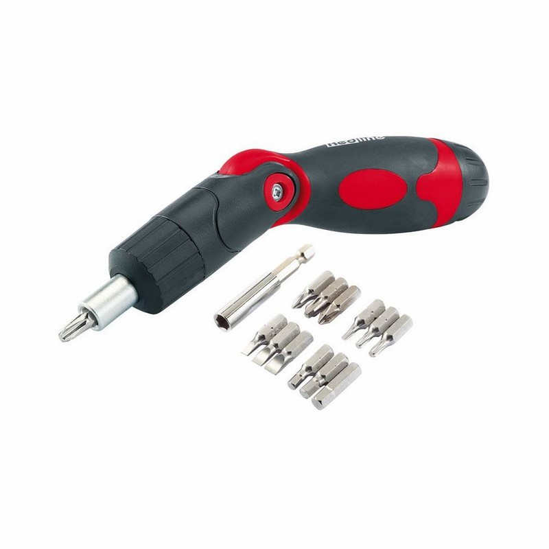 Jointed handle swivels through 180° to a pistol grip with forward/ reverse ratcheting capability. The hardened and tempered steel insert bits and bit holder are stored within handle. Multiples of 12 sets only, supplied in countertop display.