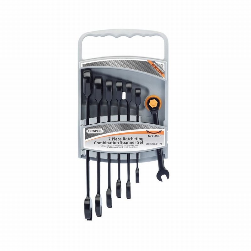 Draper 7 Piece Combination Ratchet Spanner Set – 7 x 12 point Draper HI-TORQ rings and open end is set at 15° angle.