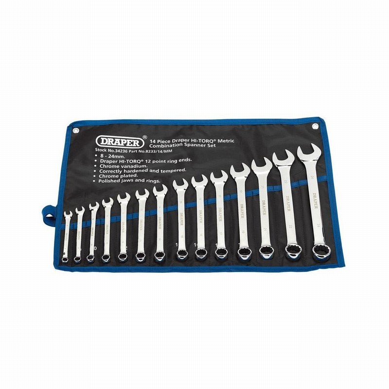 Forged from chrome vanadium steel hardened, tempered and chrome plated for corrosion protection. Draper HI-TORQ® ring end offset at 15°. Jaw offset at 15°. Supplied in vinyl divided wallet with tie cord. Display carton.