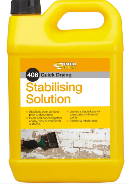 406 Stabilising Solution is a microscopically fine polymer emulsion that penetrates dusty, chalky and badly weathered surfaces to leave a stable sound base for decoration with paint, wallpaper, tiling and more.