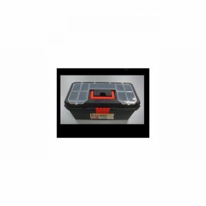 Handy toolbox with storage compartments in the lid. Useful storage caddy tray under folding lid. Made from tough plastic making it both strong and lightweight. Build in carrying handle. Semi-transparent lid allowing you to easily see the contents of the storage compartments.