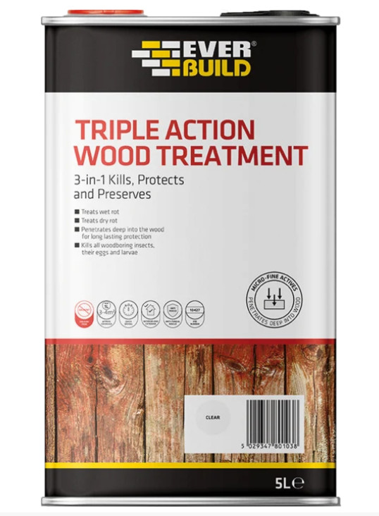 Triple Action takes care of remedial wood treatment and preservation in one can. It is specially designed to deeply penetrate all wood and joinery to give lasting protection from damage caused by wet rot, dry rot, fungi and wood boring insects/larvae.