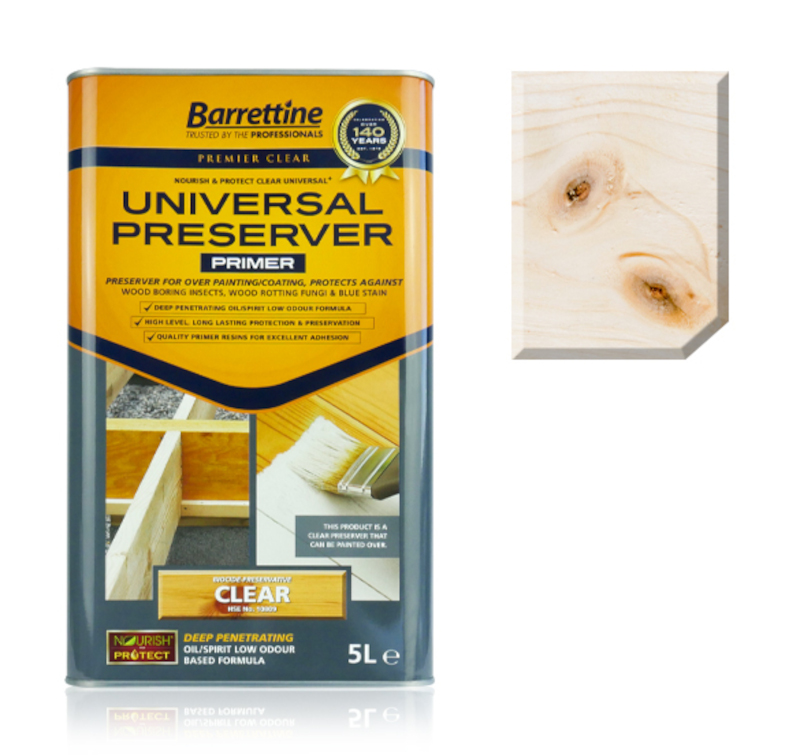 Barrettine Clear Universal Wood Preserver is a ‘colourless’ high-quality, low odour oil/Spirit wood preservative that is deep penetrating. This wax-free primer Wood Preservative is used for wood protection against wood-destroying fungi (wet rot), wood discolouring fungi and wood-boring insects.